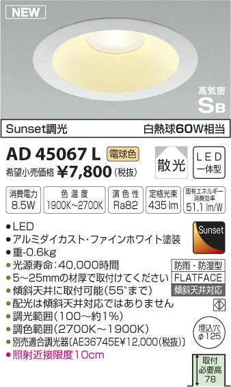 | 補足・注意事項 | ◆消費電力:8.5W ◆色温度:2700K ◆演色性:Ra82 ◆光源寿命:40,000時間 ◆5~25mmの材厚で取付けてください ◆傾斜天井に取付可能(55°まで) ◆配光は傾斜天井対応ではありません ◆調光範囲(100~約1%) ◆調色範囲(2700K~1900K) ◆別売適合調光器〔AE36745E \12,000(税抜)〕 ◆別売適合調光器〔AE36745E \12,000(税抜)〕 ◆照射近接限度10cm ※色温度:1900~2700K ※白熱球60W相当 |