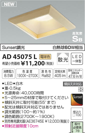 | 補足・注意事項 | ◆消費電力:8.5W ◆色温度:2700K ◆演色性:Ra82 ◆光源寿命:40,000時間 ◆5~25mmの材厚で取付けてください ◆傾斜天井に取付可能(55°まで) ◆配光は傾斜天井対応ではありません ◆調光範囲(100~約1%) ◆調色範囲(2700K~1900K) ◆別売適合調光器〔AE36745E \12,000(税抜)〕 ◆別売適合調光器〔AE36745E \12,000(税抜)〕 ◆照射近接限度10cm ※色温度:1900~2700K ※白熱球60W相当 |