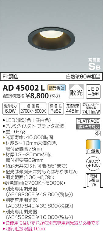 | 補足・注意事項 | ◆消費電力:6W ◆色温度:2700K ◆演色性:Ra82 ◆光源寿命:40,000時間 ◆材厚5~13mm未満の時、取付必要高78mm ◆材厚13~25mmの時、取付必要高89mm ◆傾斜天井に取付可能(55°まで) ◆配光は傾斜天井対応ではありません ◆調光範囲(100~約3%) ◆調色範囲(2700K~5000K) ◆別売専用調光器〔AE49236E \49,800(税抜)〕 ◆別売専用調光器〔AE39784E \39,800(税抜)〕 ◆別売専用調光器〔AE45829E \16,800(税抜)〕 ◆ご使用にはいずれかの別売専用調光器が必要です ◆照射近接限度10cm ※色温度:2700K~5000K ※白熱球60W相当 |