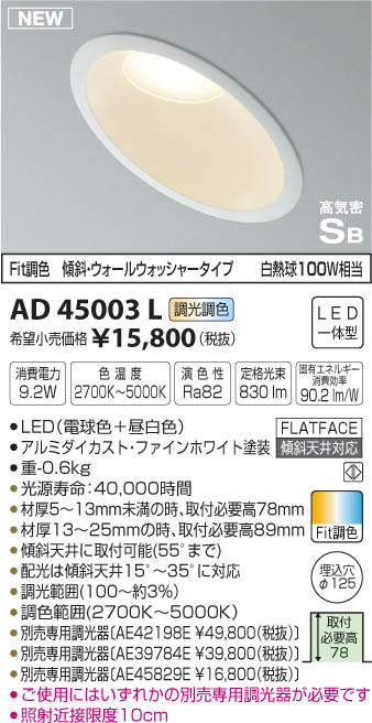 | 補足・注意事項 | ◆消費電力:9.2W ◆色温度:2700K ◆演色性:Ra82 ◆光源寿命:40,000時間 ◆材厚5~13mm未満の時、取付必要高78mm ◆材厚13~25mmの時、取付必要高89mm ◆傾斜天井に取付可能(55°まで) ◆配光は傾斜天井15°~35°に対応 ◆調光範囲(100~約3%) ◆調色範囲(2700K~5000K) ◆別売専用調光器〔AE42198E \49,800(税抜)〕 ◆別売専用調光器〔AE39784E \39,800(税抜)〕 ◆別売専用調光器〔AE45829E \16,800(税抜)〕 ◆別売専用調光器〔AE42198E \49,800(税抜)〕 ◆別売専用調光器〔AE39784E \39,800(税抜)〕 ◆別売専用調光器〔AE45829E \16,800(税抜)〕 ◆ご使用にはいずれかの別売専用調光器が必要です ◆照射近接限度10cm ※色温度:2700~5000K ※白熱球100W相当 |