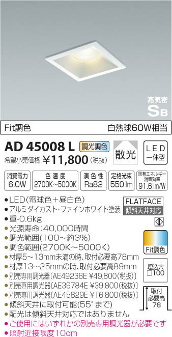 | 補足・注意事項 | ◆消費電力:6W ◆色温度:2700K ◆演色性:Ra82 ◆光源寿命:40,000時間 ◆材厚5~13mm未満の時、取付必要高78mm ◆材厚13~25mmの時、取付必要高89mm ◆傾斜天井に取付可能(55°まで) ◆配光は傾斜天井対応ではありません ◆調光範囲(100~約3%) ◆調色範囲(2700K~5000K) ◆別売専用調光器〔AE49236E \49,800(税抜)〕 ◆別売専用調光器〔AE39784E \39,800(税抜)〕 ◆別売専用調光器〔AE45829E \16,800(税抜)〕 ◆ご使用にはいずれかの別売専用調光器が必要です ◆照射近接限度10cm ※色温度:2700K~5000K ※白熱球60W相当 |