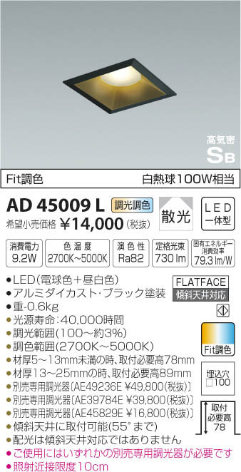 | 補足・注意事項 | ◆消費電力:9.2W ◆色温度:2700K ◆演色性:Ra82 ◆光源寿命:40,000時間 ◆材厚5~13mm未満の時、取付必要高78mm ◆材厚13~25mmの時、取付必要高89mm ◆傾斜天井に取付可能(55°まで) ◆配光は傾斜天井対応ではありません ◆調光範囲(100~約3%) ◆調色範囲(2700K~5000K) ◆別売専用調光器〔AE49236E \49,800(税抜)〕 ◆別売専用調光器〔AE39784E \39,800(税抜)〕 ◆別売専用調光器〔AE45829E \16,800(税抜)〕 ◆ご使用にはいずれかの別売専用調光器が必要です ◆照射近接限度10cm ※色温度:2700K~5000K ※白熱球100W相当 |