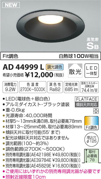 | 補足・注意事項 | ◆消費電力:9.2W ◆色温度:2700K ◆演色性:Ra82 ◆光源寿命:40,000時間 ◆材厚5~13mm未満の時、取付必要高78mm ◆材厚13~25mmの時、取付必要高89mm ◆傾斜天井に取付可能(55°まで) ◆配光は傾斜天井対応ではありません ◆調光範囲(100~約3%) ◆調色範囲(2700K~5000K) ◆別売専用調光器〔AE42198E \49,800(税抜)〕 ◆別売専用調光器〔AE39784E \39,800(税抜)〕 ◆別売専用調光器〔AE45829E \16,800(税抜)〕 ◆別売専用調光器〔AE42198E \49,800(税抜)〕 ◆別売専用調光器〔AE39784E \39,800(税抜)〕 ◆別売専用調光器〔AE45829E \16,800(税抜)〕 ◆ご使用にはいずれかの別売専用調光器が必要です ◆照射近接限度10cm ※色温度:2700~5000K ※白熱球100W相当 |