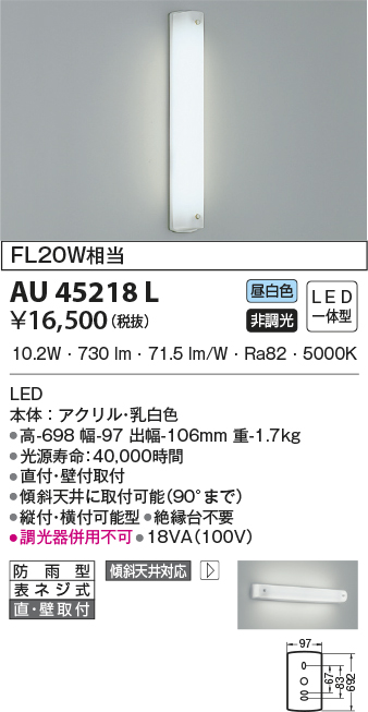 | 補足・注意事項 | ◆消費電力:10.2W ◆色温度:5000K ◆演色性:Ra82 ◆光源寿命:40,000時間 ◆直付・壁付取付 ◆傾斜天井に取付可能(90°まで) ◆縦付・横付可能型 ◆絶縁台不要 ◆調光器併用不可 |