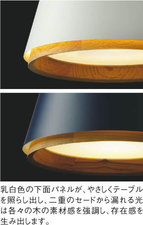 | 部位・材質・色・仕上げ | セード:鋼・マットファインホワイト塗装 飾:レッドオーク 下面パネル:アクリル・乳白色 |