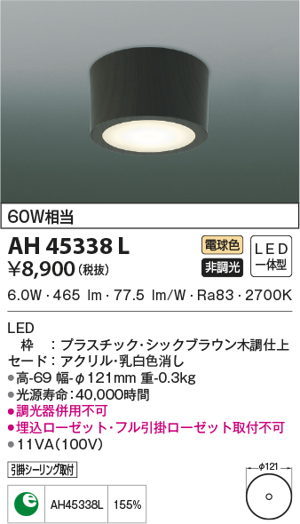 | 補足・注意事項 | ◆消費電力:6.0W ◆光束値:465lm ◆11VA(100V) ◆色温度:2700K ◆演色性:Ra83 ◆光源寿命:40,000時間 ◆調光器併用不可 ◆埋込ローゼット・フル引掛ローゼット取付不可 |