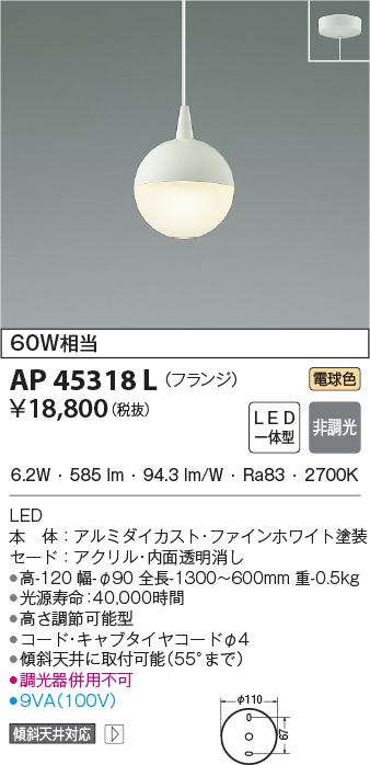 | 補足・注意事項 | ◆消費電力:6.2W ◆色温度:2700K ◆演色性:Ra83 ◆光源寿命:40,000時間 ◆高さ調節可能型 ◆傾斜天井に取付可能(55°まで) ◆コード・キャブタイヤコードφ4 ◆調光器併用不可 |