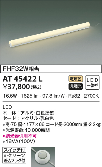 | 補足・注意事項 | ◆消費電力:16.6W ◆色温度:2700K ◆演色性:Ra82 ◆光源寿命:40,000時間 ◆調光器併用不可 |