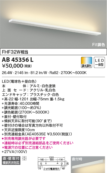 | 補足・注意事項 | ◆消費電力:26.4W ◆色温度:2700K~5000K ◆演色性:Ra82 ◆光源寿命:40,000時間 ◆調光範囲(100~約3%) ◆調色範囲(2700K~5000K) ◆直付・壁付取付 ◆傾斜天井に取付可能(90°まで) ◆壁付けの場合は写真方向以外取付不可 ◆天井近接限度10cm ◆別売連結金具〔AE40535E \3,500(税抜)〕 ◆別売専用調光器が必要です ※連結時は必ず別売連結部品をご使用ください ※電源穴の位置にご注意ください |