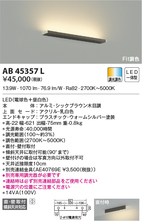 | 補足・注意事項 | ◆消費電力:13.9W ◆色温度:2700K~5000K ◆演色性:Ra82 ◆光源寿命:40,000時間 ◆調光範囲(100~約3%) ◆調色範囲(2700K~5000K) ◆直付・壁付取付 ◆傾斜天井に取付可能(90°まで) ◆壁付けの場合は写真方向以外取付不可 ◆天井近接限度10cm ◆別売連結金具〔AE40769E \3,500(税抜)〕 ◆別売専用調光器が必要です ※連結時は必ず別売連結部品をご使用ください ※電源穴の位置にご注意ください |