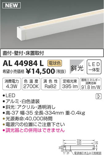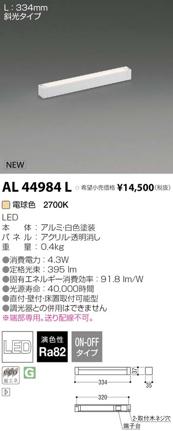 | 補足・注意事項 | ◆消費電力:4.3W ◆色温度:2700K ◆演色性:Ra82 ◆光源寿命:40,000時間 ◆直付・壁付・床置取付可能型 ◆調光器との併用はできません ※端部専用。送り配線不可。 |