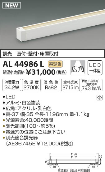 | 補足・注意事項 | ◆消費電力:34.2W ◆色温度:2700K ◆演色性:Ra82 ◆光源寿命:40,000時間 ◆調光範囲(100~約5%) ◆電源穴の位置にご注意下さい ◆別売適合調光器〔AE36745E \12,000(税抜)〕 ◆別売適合調光器〔AE36745E \12,000(税抜)〕 ※色温度:2700K |