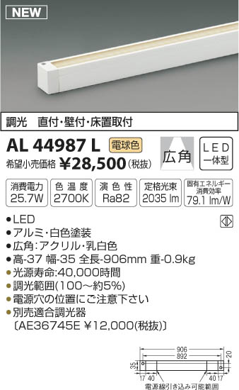 | 補足・注意事項 | ◆消費電力:25.7W ◆色温度:2700K ◆演色性:Ra82 ◆光源寿命:40,000時間 ◆調光範囲(100~約5%) ◆電源穴の位置にご注意下さい ◆別売適合調光器〔AE36745E \12,000(税抜)〕 ◆別売適合調光器〔AE36745E \12,000(税抜)〕 ※色温度:2700K |