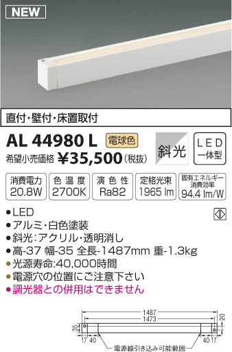 | 補足・注意事項 | ◆消費電力:20.8W ◆色温度:2700K ◆演色性:Ra82 ◆光源寿命:40,000時間 ◆直付・壁付・床置取付可能型 ◆調光器との併用はできません |
