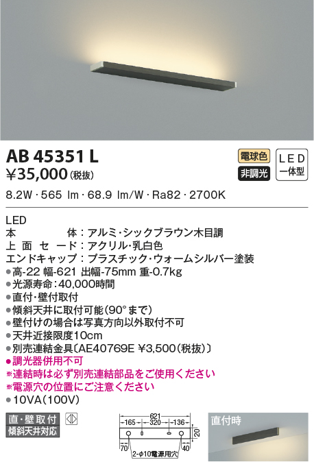 | 補足・注意事項 | ◆消費電力:8.2W ◆色温度:2700K ◆演色性:Ra82 ◆光源寿命:40,000時間 ◆直付・壁付取付 ◆傾斜天井に取付可能(90°まで) ◆壁付けの場合は写真方向以外取付不可 ◆天井近接限度10cm ◆別売連結金具〔AE40769E \3,500(税抜)〕 ◆調光器併用不可 ※連結時は必ず別売連結部品をご使用ください ※電源穴の位置にご注意ください |
