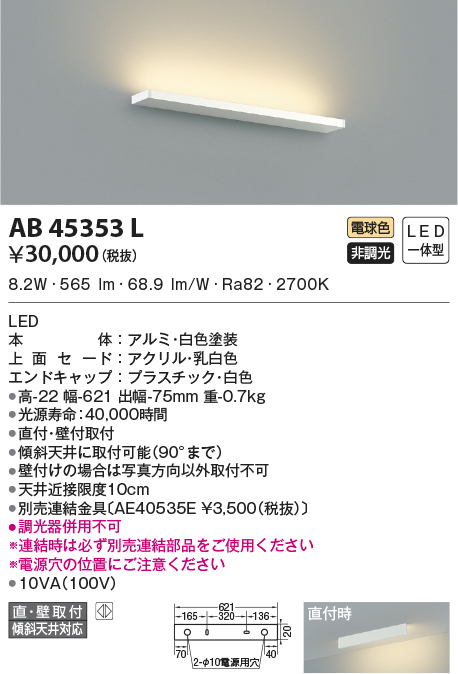 | 補足・注意事項 | ◆消費電力:8.2W ◆色温度:2700K ◆演色性:Ra82 ◆光源寿命:40,000時間 ◆直付・壁付取付 ◆傾斜天井に取付可能(90°まで) ◆壁付けの場合は写真方向以外取付不可 ◆天井近接限度10cm ◆別売連結金具〔AE40535E \3,500(税抜)〕 ◆調光器併用不可 ※連結時は必ず別売連結部品をご使用ください ※電源穴の位置にご注意ください |