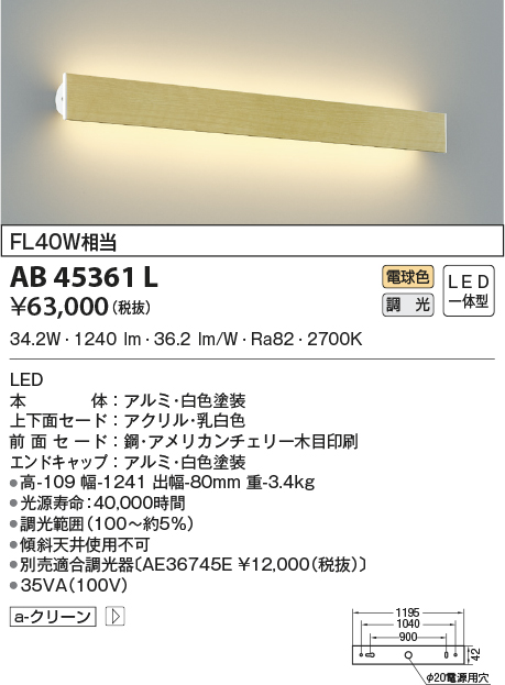 | 補足・注意事項 | ◆消費電力:34.2W ◆色温度:2700K ◆演色性:Ra82 ◆光源寿命:40,000時間 ◆調光範囲(100~約5%) ◆傾斜天井使用不可 ◆別売適合調光器〔AE36745E \12,000(税抜)〕 |