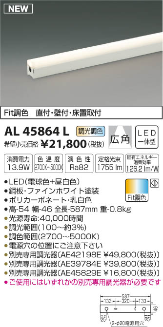 | 補足・注意事項 | ◆消費電力:13.9W ◆色温度:2700K ◆演色性:Ra82 ◆光源寿命:40,000時間 ◆調光範囲(100~約3%) ◆調色範囲(2700~5000K) ◆電源穴の位置にご注意下さい ◆別売専用調光器〔AE42198E \49,800(税抜)〕 ◆別売専用調光器〔AE39784E \39,800(税抜)〕 ◆別売専用調光器〔AE45829E \16,800(税抜)〕 ◆別売専用調光器〔AE42198E \49,800(税抜)〕 ◆別売専用調光器〔AE39784E \39,800(税抜)〕 ◆別売専用調光器〔AE45829E \16,800(税抜)〕 ◆ご使用にはいずれかの別売専用調光器が必要です ※色温度:2700~5000K |