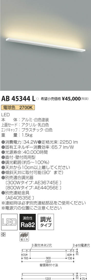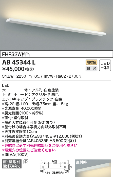 | 補足・注意事項 | ◆消費電力:34.2W ◆色温度:2700K ◆演色性:Ra82 ◆光源寿命:40,000時間 ◆調光範囲(100~約5%) ◆直付・壁付取付 ◆傾斜天井に取付可能(90°まで) ◆壁付けの場合は写真方向以外取付不可 ◆天井近接限度10cm ◆別売適合調光器〔AE36745E \12,000(税抜)〕 ◆別売連結金具〔AE40535E \3,500(税抜)〕 ※連結時は必ず別売連結部品をご使用ください ※電源穴の位置にご注意ください |