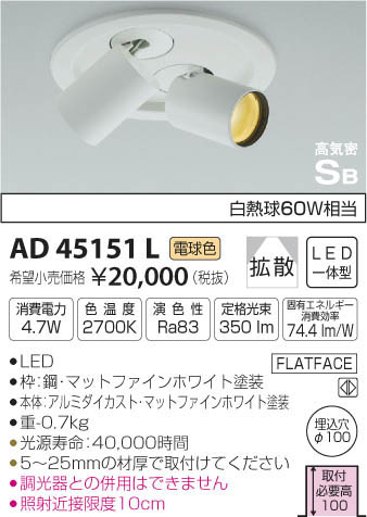 | 補足・注意事項 | ◆消費電力:4.7W ◆色温度:2700K ◆演色性:Ra83 ◆光源寿命:40,000時間 ◆5~25mmの材厚で取付けてください ◆調光器との併用はできません ◆照射近接限度10cm ※色温度:2700K ※白熱球60W相当 |
