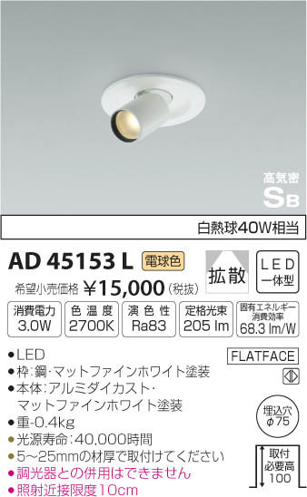 | 補足・注意事項 | ◆消費電力:3W ◆色温度:2700K ◆演色性:Ra83 ◆光源寿命:40,000時間 ◆5~25mmの材厚で取付けてください ◆調光器との併用はできません ◆照射近接限度10cm ※色温度:2700K ※白熱球40W相当 |