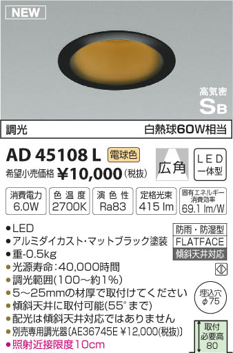 | 補足・注意事項 | ◆消費電力:6W ◆色温度:2700K ◆演色性:Ra83 ◆光源寿命:40,000時間 ◆調光範囲(100~約1%) ◆5~25mmの材厚で取付けてください ◆傾斜天井に取付可能(55°まで) ◆配光は傾斜天井対応ではありません ◆別売専用調光器〔AE36745E \12,000(税抜)〕 ◆別売適合調光器〔AE36745E \12,000(税抜)〕 ◆照射近接限度10cm ※色温度:2700K ※白熱球60W相当 |