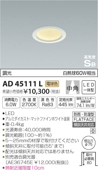 | 補足・注意事項 | ◆消費電力:6W ◆色温度:2700K ◆演色性:Ra83 ◆光源寿命:40,000時間 ◆調光範囲(100~約1%) ◆5~25mmの材厚で取付けてください ◆傾斜天井に取付可能(55°まで) ◆配光は傾斜天井対応ではありません ◆別売適合調光器〔AE36745E \12,000(税抜)〕 ◆照射近接限度10cm ※色温度:2700K ※白熱球60W相当 |