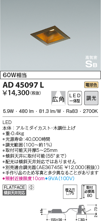 | 補足・注意事項 | ◆消費電力:5.9W ◆色温度:2700K ◆演色性:Ra83 ◆光源寿命:40,000時間 ◆調光範囲(100~約1%) ◆取付可能天井厚5~25mm ◆傾斜天井に取付可能(55°まで) ◆配光は傾斜天井対応ではありません ◆別売適合調光器〔AE36745E \12,000(税抜)〕 ◆手作り品のため写真と多少異なることがあります ◆照射近接限度10cm |