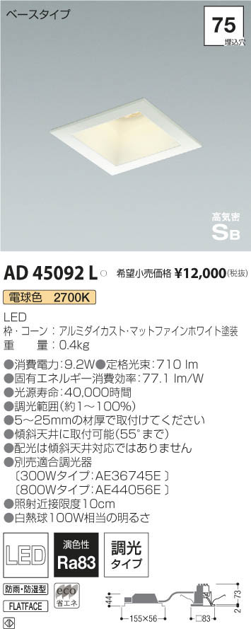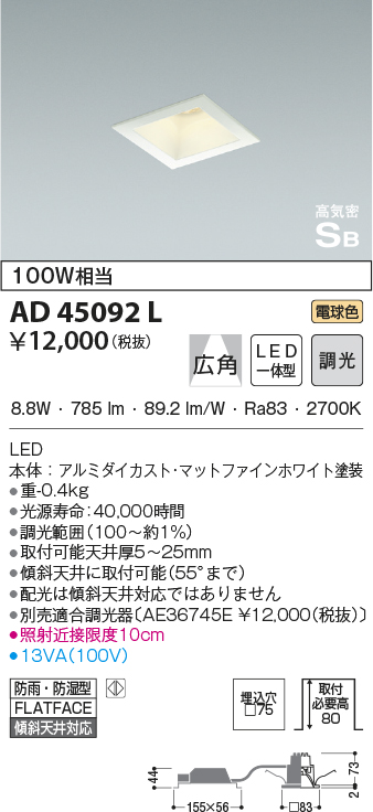| 補足・注意事項 | ◆消費電力:8.8W ◆色温度:2700K ◆演色性:Ra83 ◆光源寿命:40,000時間 ◆調光範囲(100~約1%) ◆取付可能天井厚5~25mm ◆傾斜天井に取付可能(55°まで) ◆配光は傾斜天井対応ではありません ◆別売適合調光器〔AE36745E \12,000(税抜)〕 ◆照射近接限度10cm |