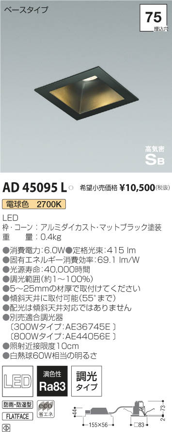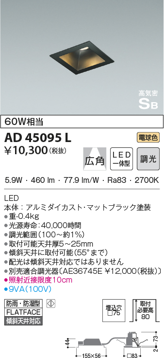 | 補足・注意事項 | ◆消費電力:5.9W ◆色温度:2700K ◆演色性:Ra83 ◆光源寿命:40,000時間 ◆調光範囲(100~約1%) ◆取付可能天井厚5~25mm ◆傾斜天井に取付可能(55°まで) ◆配光は傾斜天井対応ではありません ◆別売適合調光器〔AE36745E \12,000(税抜)〕 ◆照射近接限度10cm |