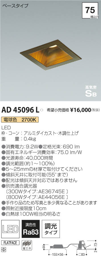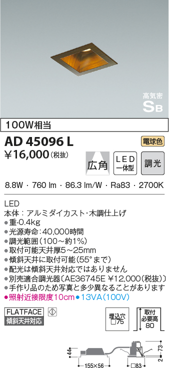 | 補足・注意事項 | ◆消費電力:8.8W ◆色温度:2700K ◆演色性:Ra83 ◆光源寿命:40,000時間 ◆調光範囲(100~約1%) ◆取付可能天井厚5~25mm ◆傾斜天井に取付可能(55°まで) ◆配光は傾斜天井対応ではありません ◆別売適合調光器〔AE36745E \12,000(税抜)〕 ◆手作り品のため写真と多少異なることがあります ◆照射近接限度10cm |