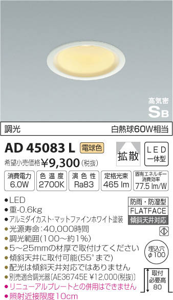| 補足・注意事項 | ◆消費電力:6W ◆色温度:2700K ◆演色性:Ra83 ◆光源寿命:40,000時間 ◆調光範囲(100~約1%) ◆5~25mmの材厚で取付けてください ◆傾斜天井に取付可能(55°まで) ◆配光は傾斜天井対応ではありません ◆別売適合調光器〔AE36745E \12,000(税抜)〕 ◆リニューアルプレートとの併用はできません ◆照射近接限度10cm ※色温度:2700K ※白熱球60W相当 |