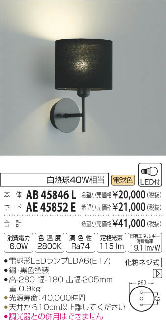 | 補足・注意事項 | ◆消費電力:6W ◆色温度:2800K ◆演色性:Ra74 ◆光源寿命:40,000時間 ◆天井から10cm以上離してください ◆調光器との併用はできません ※色温度:2800K ※白熱球40W相当 |