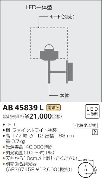 | 補足・注意事項 | ◆消費電力:8.5W ◆色温度:2700K ◆演色性:Ra83 ◆光源寿命:40,000時間 ◆調光範囲(100~約1%) ◆天井から10cm以上離してください ◆別売適合調光器〔AE36745E \12,000(税抜)〕 ※色温度:2700K ※白熱球60W相当 |