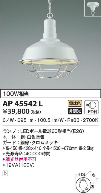 | 補足・注意事項 | ◆消費電力:6.4W ◆色温度:2700K ◆演色性:Ra83 ◆光源寿命:40,000時間 ◆調光器併用不可 |