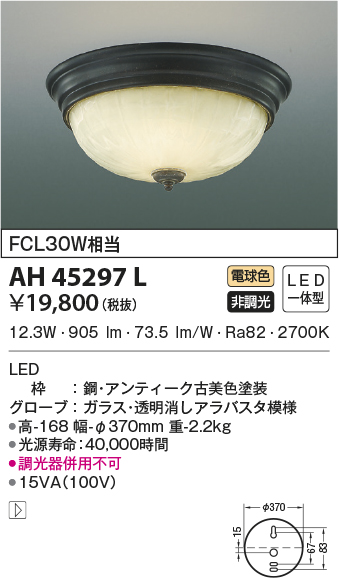 補足・注意事項 | ◆消費電力:12.3W ◆色温度:2700K ◆演色性:Ra82 ◆光源寿命:40,000時間 ◆調光器併用不可 |