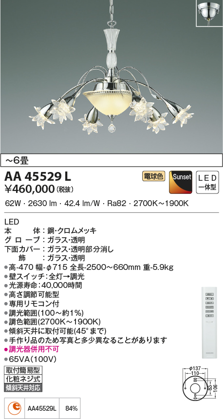 | 補足・注意事項 | ◆消費電力:62.0W ◆光束値:2630lm ◆65VA(100V) ◆色温度:2700K~1900K ◆演色性:Ra82 ◆光源寿命:40,000時間 ◆調光範囲(100~約1%) ◆高さ調節可能型 ◆専用リモコン付 ◆調色範囲(2700K~1900K) ◆手作り品のため写真と多少異なることがあります ◆調光器併用不可 ※上記の数値は、2700K時の値です |