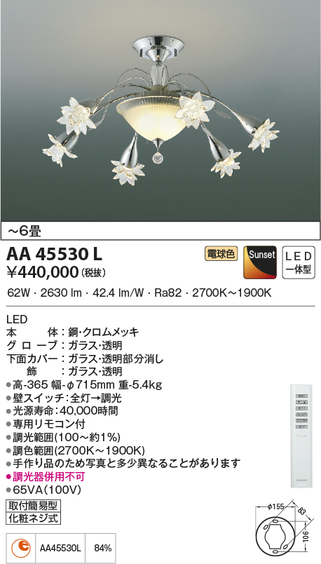 | 補足・注意事項 | ◆消費電力:62.0W ◆光束値:2630lm ◆65VA(100V) ◆色温度:2700K~1900K ◆演色性:Ra82 ◆光源寿命:40,000時間 ◆調光範囲(100~約1%) ◆専用リモコン付 ◆調色範囲(2700K~1900K) ◆手作り品のため写真と多少異なることがあります ◆調光器併用不可 ※上記の数値は、2700K時の値です |