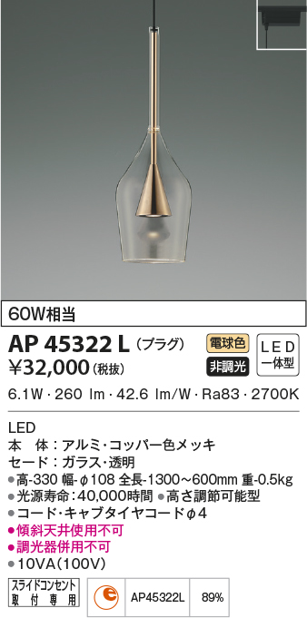 | 補足・注意事項 | ◆消費電力:6.1W ◆光束値:260lm ◆10VA(100V) ◆色温度:2700K ◆演色性:Ra83 ◆光源寿命:40,000時間 ◆高さ調節可能型 ◆コード・キャブタイヤコードφ4 ◆調光器併用不可 ◆傾斜天井使用不可 |
