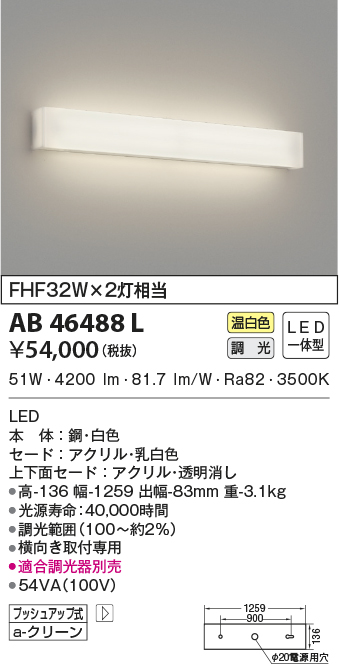 | 補足・注意事項 | ◆消費電力:51.0W ◆光束値:4200lm ◆54VA(100V) ◆色温度:3500K ◆演色性:Ra82 ◆光源寿命:40,000時間 ◆調光範囲(100~約2%) ◆横向き取付専用 ◆適合調光器別売 |