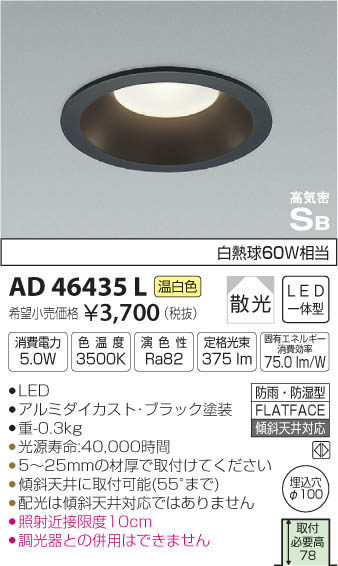 | 補足・注意事項 | ◆消費電力:5W ◆色温度:3500K ◆演色性:Ra82 ◆光源寿命:40,000時間 ◆5~25mmの材厚で取付けてください ◆傾斜天井に取付可能(55°まで) ◆配光は傾斜天井対応ではありません ◆調光器との併用はできません ◆照射近接限度10cm ※色温度:3500K ※白熱球60W相当 |