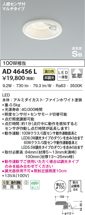 | 補足・注意事項 | ◆消費電力:9.2W ◆色温度:3500K ◆演色性:Ra83 ◆光源寿命:40,000時間 ◆照度センサ付 ◆センサモード切替可能 ◆点灯照度調節可能 ◆点灯時間:約1分(点灯中に動作を感知するとセンサが作動し、点灯時間が延長されます) ◆動作連動:G型センサ動作連動器具とLED8.0W調光タイプのダウンを含み3台まで ◆取付必要高:84mm(材厚5~13mm未満時)100mm(材厚13~25mm時) ◆動作連動でご使用いただく場合は調光タイプのみを組み合わせてください ◆調光器併用不可 ◆照射近接限度10cm |
