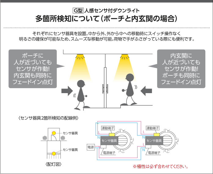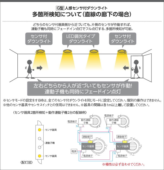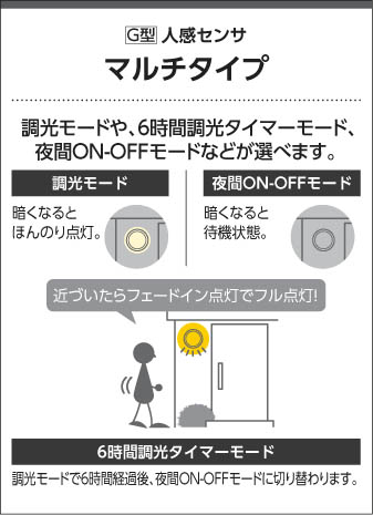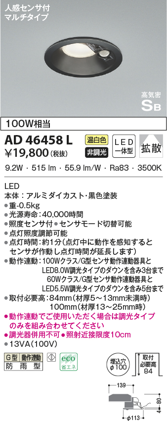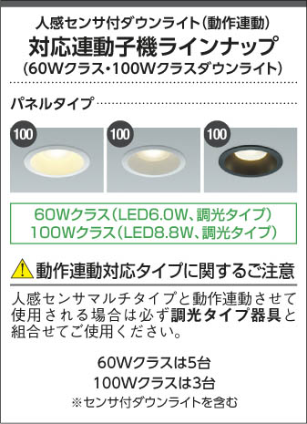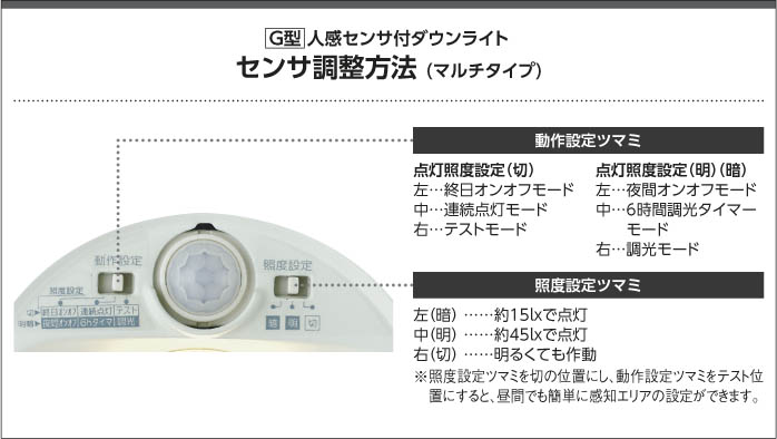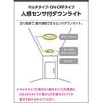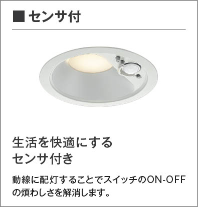 | 補足・注意事項 | ◆消費電力:9.2W ◆色温度:3500K ◆演色性:Ra83 ◆光源寿命:40,000時間 ◆照度センサ付 ◆センサモード切替可能 ◆点灯照度調節可能 ◆点灯時間:約1分(点灯中に動作を感知するとセンサが作動し、点灯時間が延長されます) ◆動作連動:G型センサ動作連動器具とLED8.0W調光タイプのダウンを含み3台まで ◆取付必要高:84mm(材厚5~13mm未満時)100mm(材厚13~25mm時) ◆動作連動でご使用いただく場合は調光タイプのみを組み合わせてください ◆調光器併用不可 ◆照射近接限度10cm |