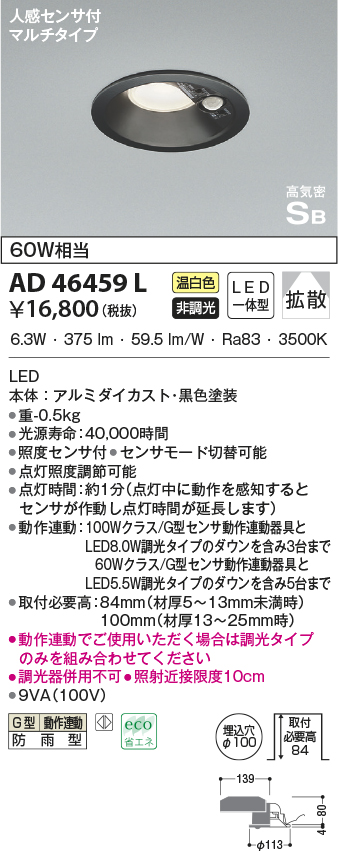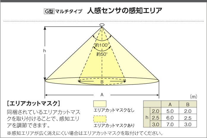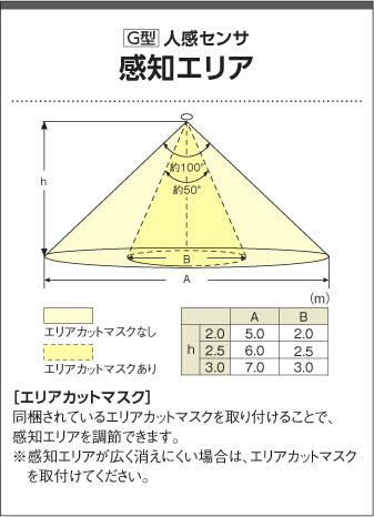 | 補足・注意事項 | ◆消費電力:6.3W ◆色温度:3500K ◆演色性:Ra83 ◆光源寿命:40,000時間 ◆照度センサ付 ◆センサモード切替可能 ◆点灯照度調節可能 ◆点灯時間:約1分(点灯中に動作を感知するとセンサが作動し、点灯時間が延長されます) ◆動作連動:G型センサ動作連動器具とLED5.5W調光タイプのダウンを含み5台まで ◆取付必要高:84mm(材厚5~13mm未満時)100mm(材厚13~25mm時) ◆動作連動でご使用いただく場合は調光タイプのみを組み合わせてください ◆調光器併用不可 ◆照射近接限度10cm |