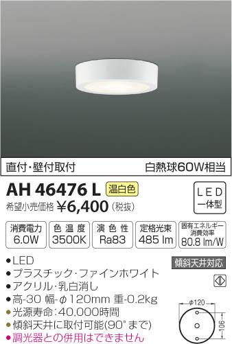 | 補足・注意事項 | ◆消費電力:6.0W ◆色温度:3500K ◆演色性:Ra83 ◆光源寿命:40,000時間 ◆傾斜天井に取付可能(90°まで) ◆調光器との併用はできません ※色温度:3500K ※白熱球60W相当 |