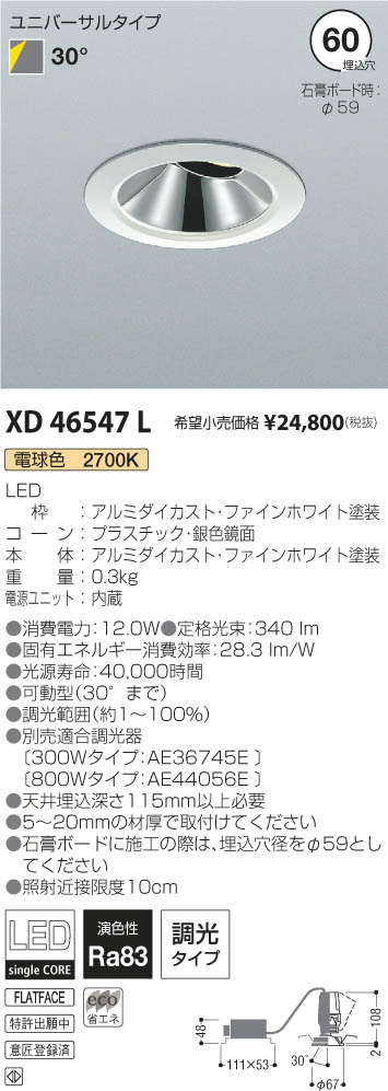 | 補足・注意事項 | ◆消費電力:12.0W ◆色温度:2700K ◆演色性:Ra83 ◆光源寿命:40,000時間 ◆可動型(30°まで) ◆調光範囲(約1~100%) ◆別売適合調光器〔300Wタイプ:AE36745E \12,000(税抜)〕〔800Wタイプ:AE44056E \15,800(税抜)〕 ◆天井埋込深さ115mm以上必要 ◆5~20mmの材厚で取付けてください ◆石膏ボードに施工の際は、埋込穴径をφ59としてください ◆照射近接限度10cm ※色温度:2700K ※JR12V50W相当 |