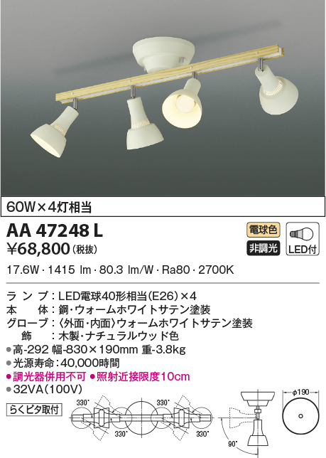 | 補足・注意事項 | ◆消費電力:17.6W ◆光束値:1415lm ◆32VA(100V) ◆色温度:2700K ◆演色性:Ra80 ◆光源寿命:40,000時間 ◆調光器併用不可 ◆照射近接限度10cm |