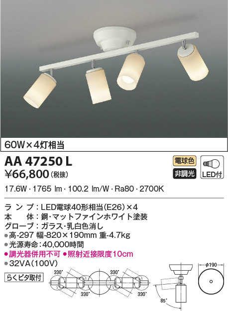 | 補足・注意事項 | ◆消費電力:17.6W ◆光束値:1765lm ◆32VA(100V) ◆色温度:2700K ◆演色性:Ra80 ◆光源寿命:40,000時間 ◆調光器併用不可 ◆照射近接限度10cm |