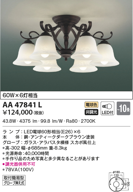 | 補足・注意事項 | ◆消費電力:43.8W ◆光束値:4375lm ◆78VA(100V) ◆色温度:2700K ◆演色性:Ra80 ◆光源寿命:40,000時間 ◆手作り品のため写真と多少異なることがあります ◆調光器併用不可 |