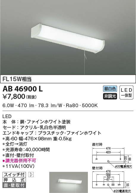 | 補足・注意事項 | ◆消費電力:6.0W ◆色温度:5000K ◆演色性:Ra80 ◆光源寿命:40,000時間 ◆直付・壁付取付 ◆調光器併用不可 |